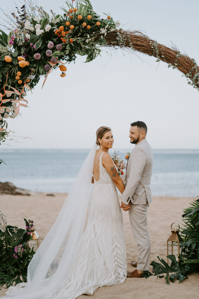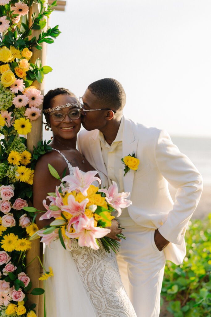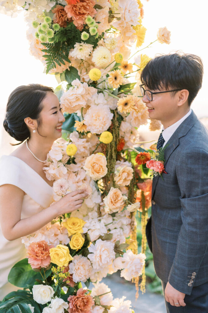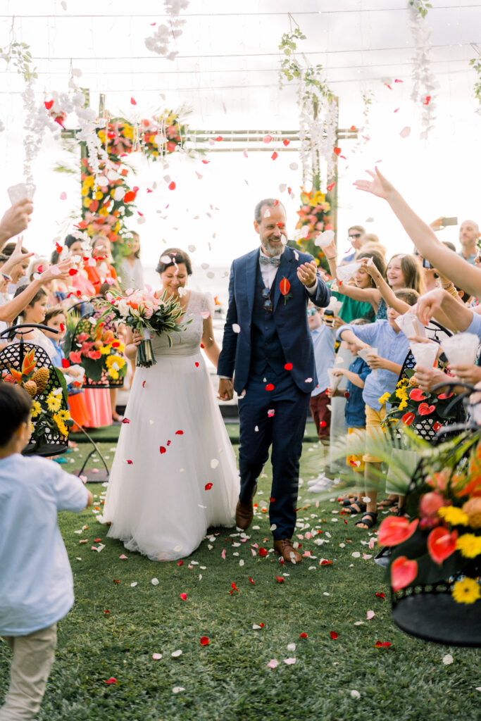Eloping is perfect for the spontaneous couple but also great for those who like to plan ahead. Unlike a traditional wedding, an elopement is a beautiful way to keep your ceremony intimate and focused on what is most important for you and your partner. Lush ceremony ground florals of mustard garden roses, ranunculus, orchids, anthuriums, bougainvillea, and exotic foliage's envelop the couple.